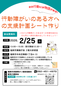 対象者 福岡市内で行動障がいのある方への支援を実施している事務所およびこれから実施を検討している事務所職員など